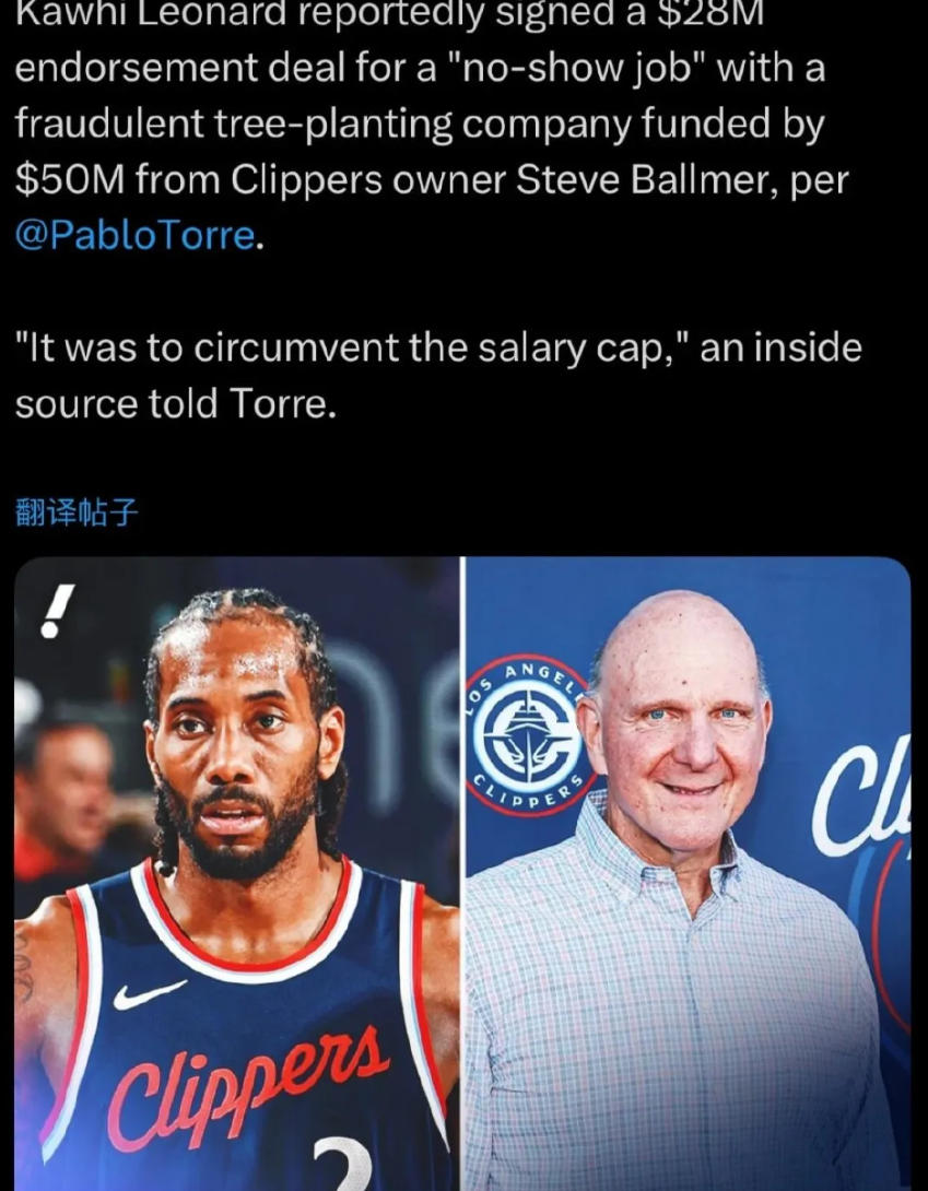 作为代价,鲍尔默给这家公司注资了5000万美元。这家公司的合同还明确表示,伦纳德必须为快船队效力,一旦离队就拿不满全部的2800万美元。Pablo Torre随后采访了这家公司的一个主管人员,后者直接表示,这就是快船队在规避工资帽。